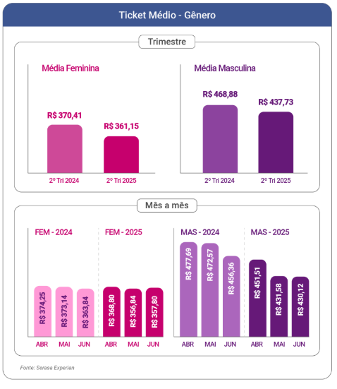 No recorte por gênero, os homens apresentaram uma redução mais acentuada, passando de R$ 468,88 para R$ 437,73, uma diferença de R$ 31,15. Já o ticket médio entre as mulheres caiu de R$ 370,41 no segundo trimestre de 2024 para R$ 361,15 no mesmo período de 2025, uma retração de R$ 9,26. No gráfico abaixo, o valor do ticket médio a cada mês no trimestre em 2024 e 2025.