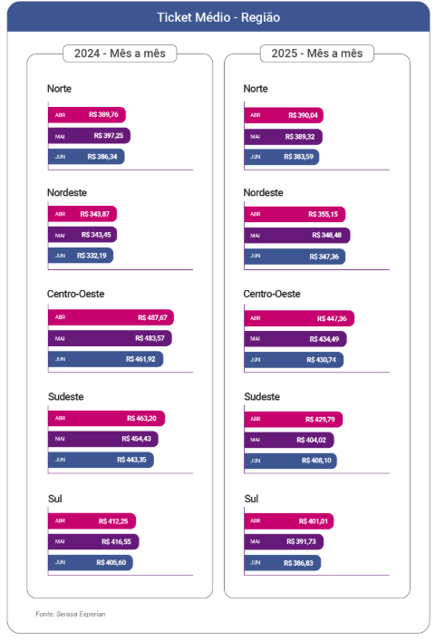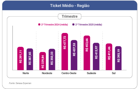 Regionalmente, a região Centro-Oeste apresentou o maior ticket médio em ambos os períodos, apesar da queda de R$ 477,72 para R$ 437,53. Já o Nordeste seguiu com os menores valores médios, embora tenha registrado leve avanço no comparativo anual, passando de R$ 339,84 para R$ 350,33. Os números das demais regiões estão no gráfico abaixo.
