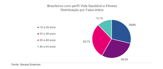 A análise também indica que a afinidade com o tema aparece de forma distribuída entre faixas etárias, com presença consistente entre diferentes gerações, com consistência entre 18 e 48 anos. Esse retrato ajuda a reforçar que “vida saudável e fitness” não é um assunto com uma cara só: Segundo Giroto, há motivações e momentos de consumo variados, que vão de autocuidado e rotina a performance, saúde preventiva e bem-estar no dia a dia. Confira, abaixo um gráfico que detalha a divisão por faixa etária: