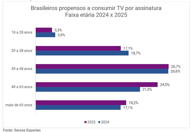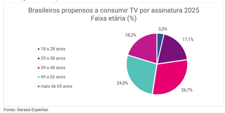 Em relação à faixa etária, o público com maior propensão à TV por assinatura segue concentrado em adultos de meia-idade. A maior parcela está na faixa dos 39 a 48 anos, que manteve praticamente a mesma participação de um ano para o outro (de 26,6% em 2024 para 26,7% em 2025). Em seguida, destaca-se o crescimento entre pessoas de 49 a 65 anos, cuja presença aumentou de 21% para 24,5%, e entre os mais de 65 anos, que passaram de 17,1% para 18,2%.
