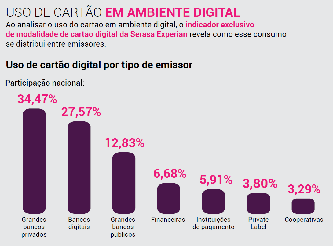O recorte indica uma mudança relevante na dinâmica competitiva do setor, com crescimento dos bancos digitais no momento do pagamento, mas mantém relevância dos grandes bancos, que concentram metade das transações online.