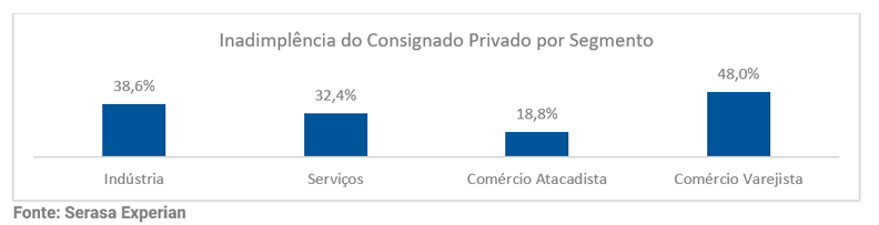 Entre as companhias que conhecem o crédito do trabalhador, a inadimplência é mais alta nas empresas de médio porte (43,8%), enquanto as pequenas registram 28,6% dos casos e as grandes, 24,3%. Regionalmente, o índice mostra mais representatividade no Nordeste (42,1%) e no Sudeste (33,3%). Por setor, a indústria (38,6%) e o comércio varejista (48%) concentram a maior parte dos casos. Confira no gráfico abaixo os dados completos de cada segmento: